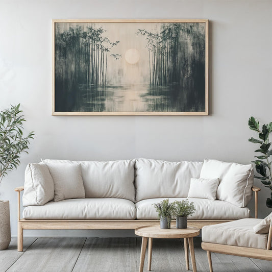 Moonlit Bamboo Grove Japanese Abstract Oil Painting Effect Poster Print Serene Nightscape Wall Art Decor
