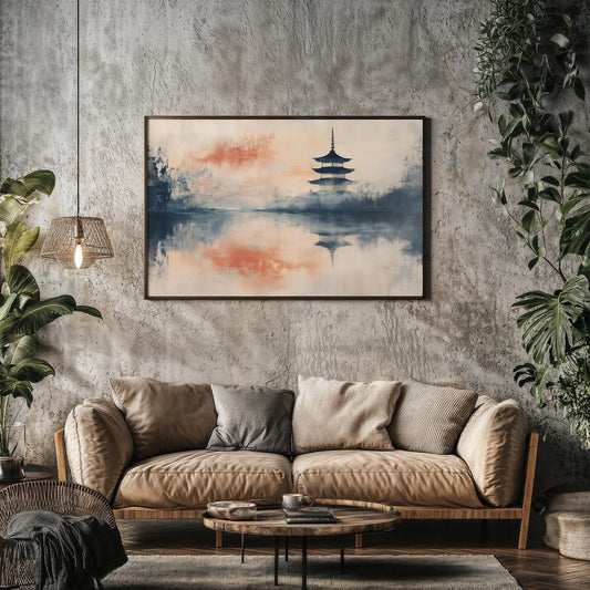 Golden Pagoda Dreams Japanese Abstract Oil Painting Effect Poster Print Tranquil Reflection Art Wall Decor