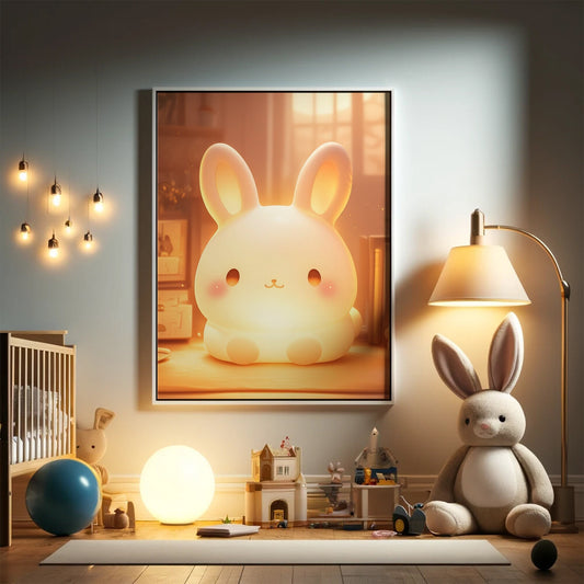 Art Print, Happy Hikari Light-Up Bunny Whimsical Poster for Nursery or Playroom, Kawaii Charm, Cozy Corner Decor, Pastel Palette, Tranquil