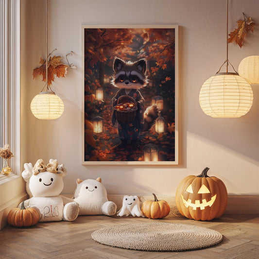 Anime Tanuki Yukata Rolled Posters Wall Art, Cute Halloween Decor, Japanese Village Art Print, Autumn Leaves Poster, Kawaii Raccoon Dog