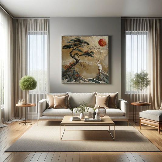 Canvas Print, Vintage Pine Tree and Crane Artwork, Asian-Inspired Home Decor - Stretched Matte Canvas, 0.75", Sunset Landscape,