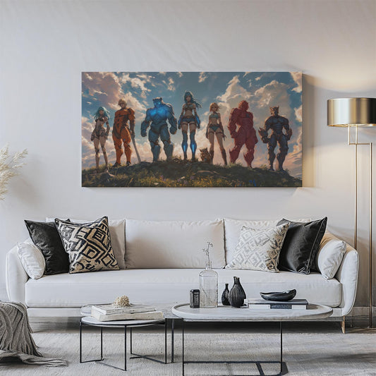 Epic Anime Hero Team in Armor Wide Horizontal Canvas Print Futuristic Sci-Fi Poster Art Gift for Gamer Wall Decor