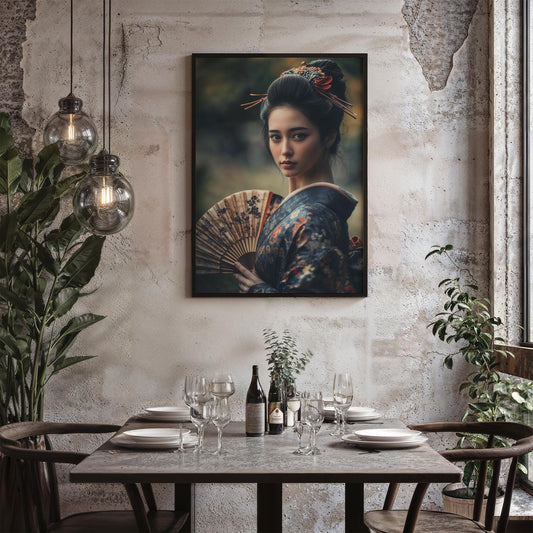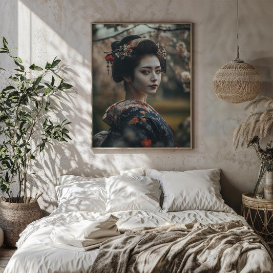 Geisha in Cherry Blossom Garden Traditional Japanese Sakura Wall Art Portrait Poster Print