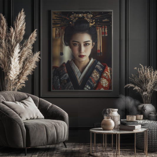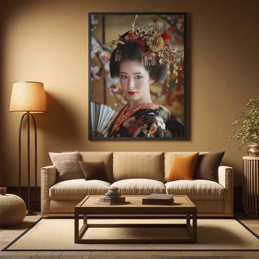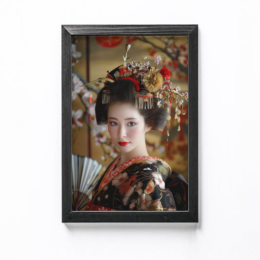 Wall Art, Geisha Beauty, Japanese Culture, Serene Elegance, Floral Kimono, Cherry Blossoms, Red Gold Black Decor, Sophisticated Home Decor,