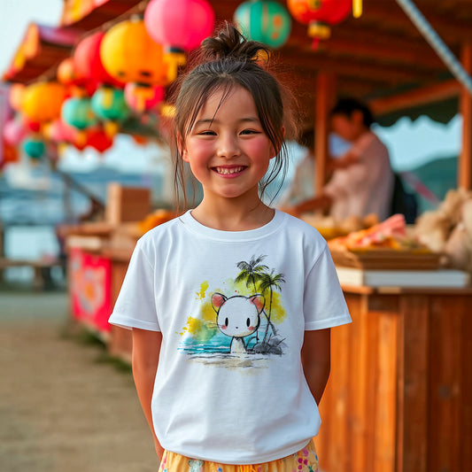 Kids Kawaii Beach T-Shirt, Anime Watercolor Ink Sketch Tee, Manga Style Summer Top, Gift for Anime Loving Children