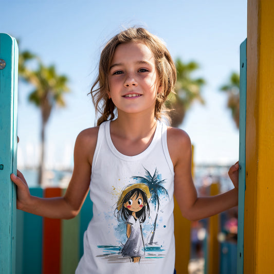 Kids Kawaii Beach Tank Top, Anime Watercolor Ink Sketch Sleeveless Tee, Manga Style Summer Shirt, Gift for Little Anime Fans