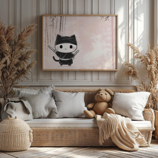 Kawaii Ninja Cat in Training Japanese-Inspired Playful Kids Room Wall Art