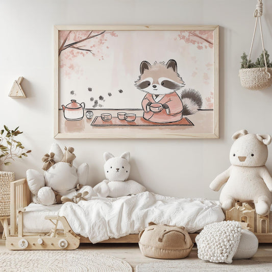 Tea Time with Tanuki Japanese-Inspired Cozy Kids Room Kawaii Wall Art