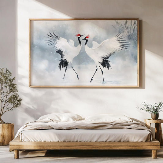 The Cranes Dance in Snow Poster Print, Japanese Sumi-e Artwork, Red-Crowned Crane Wall Decor, Zen Gift for Art Lovers and Meditation Spaces