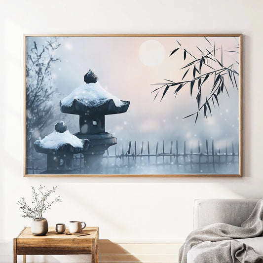 Moonlit Snow Garden Poster Print - Japanese Winter Night Art - Zen-Inspired Wall Decor - Elegant Gift for Meditation Spaces