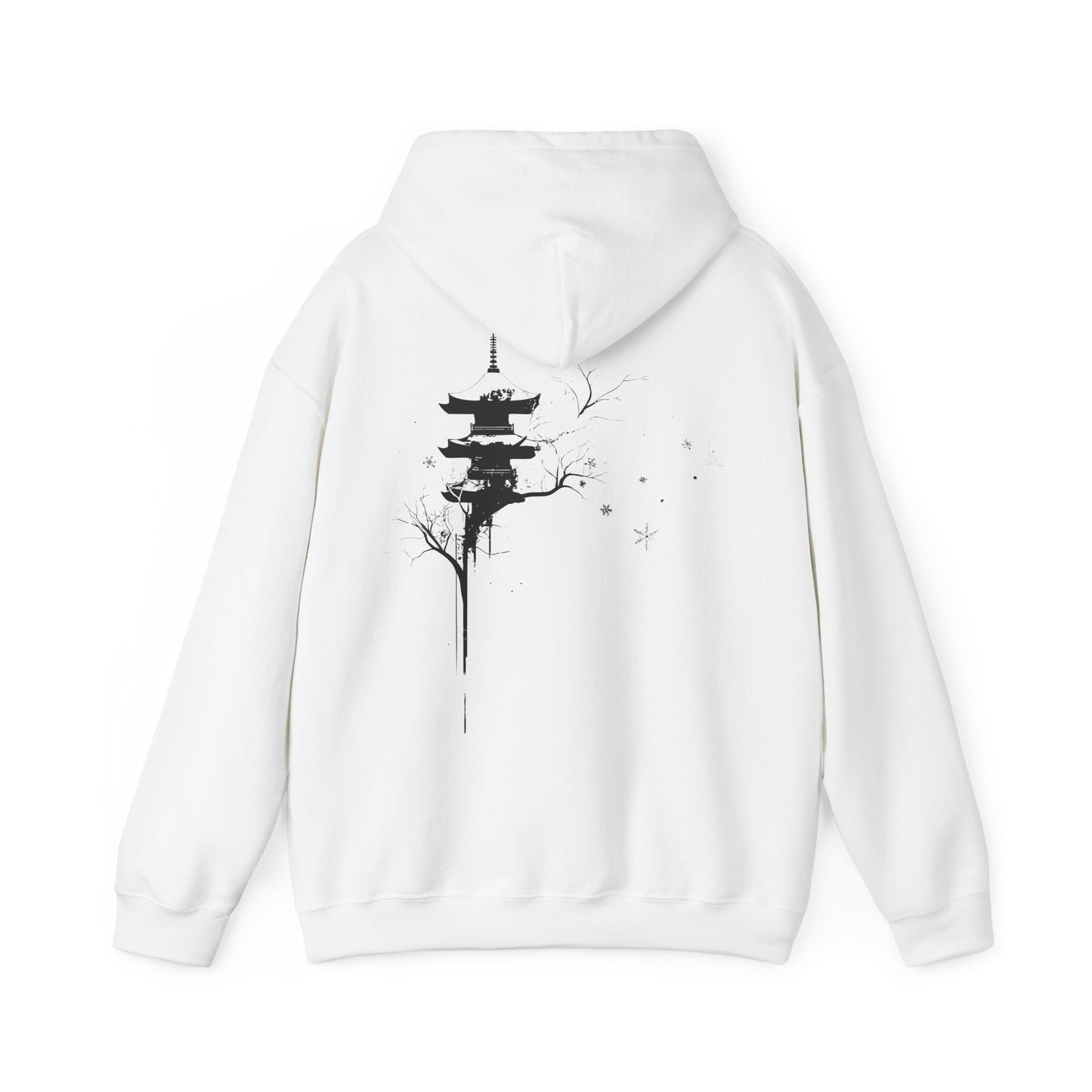 Elevate your winter streetwear collection with this stunning light-colored hoodie featuring a minimalist black line art design of a Japanese pagoda. Inspired by traditional Japanese aesthetics, the intricate black pagoda artwork is beautifully printed on the back, offering a clean, elegant look.